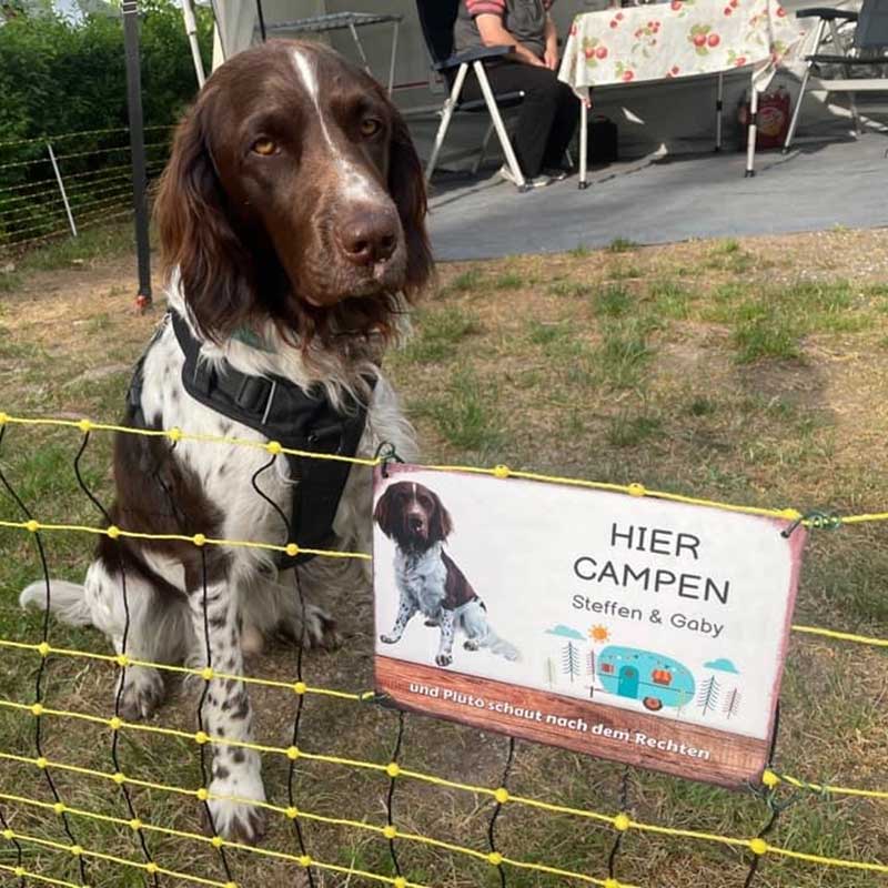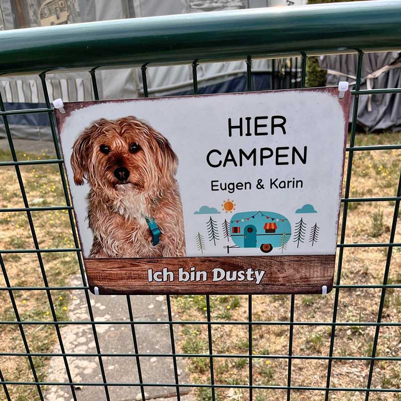 Dein Hunde-Campingschild ist ein echter Hingucker am Wohnwagen, Wohnmobil, am Gartenzaun oder an der Pforte.