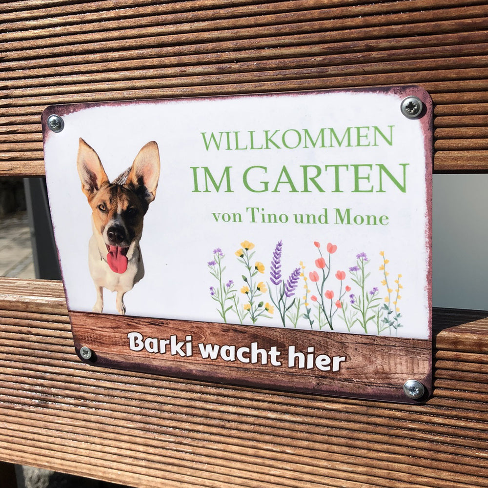 Personalisiert mit den Namen der Gartenbesitzer und Foto von deinem Hund bei dem wir automatisch den Hintergrund entfernen.