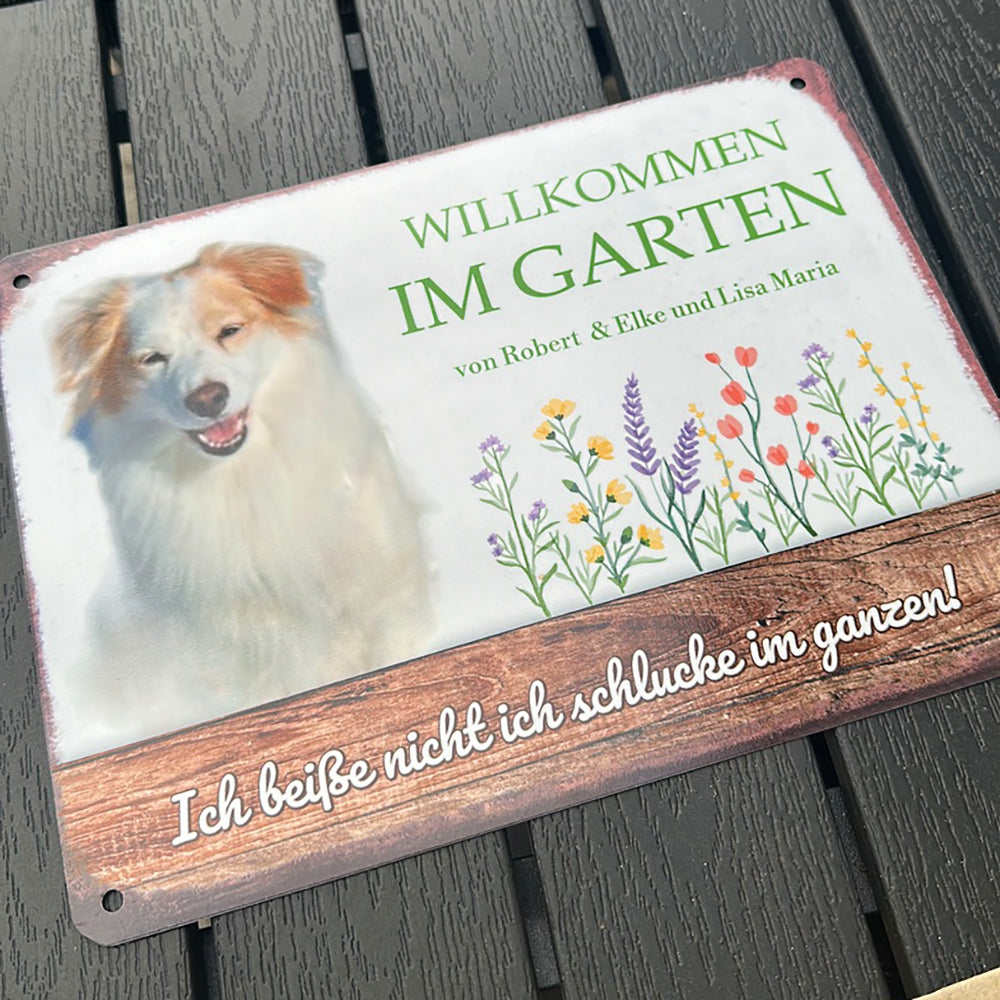 Lade dein Wunschfoto hoch, gebe die Namen der Gartenbesitzer ein. So wird es ein Unikat! Auch eine originelle Geschenkidee für alle Hundefreunde.