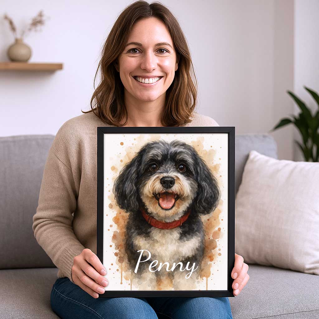 Aus deinem Tierfoto entsteht ein einzigartiges Kunstwerk – liebevoll gestaltet und in einem hochwertigen Kunststoffrahmen (schwarz oder weiß, 30×40 cm) mit klarer Acrylglasscheibe präsentiert.